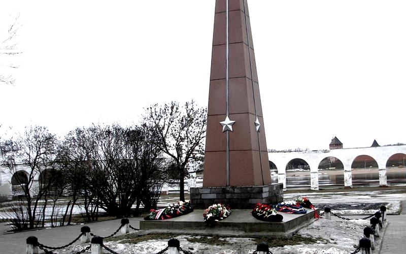 Памятник на Ярославовом дворище увековечил подвиг трёх героев 299-го полка, закрывших телами вражеские амбразуры в бою под Новгородом в 1942 году. Самоотверженность героев спасла отряд от неминуемой гибели.