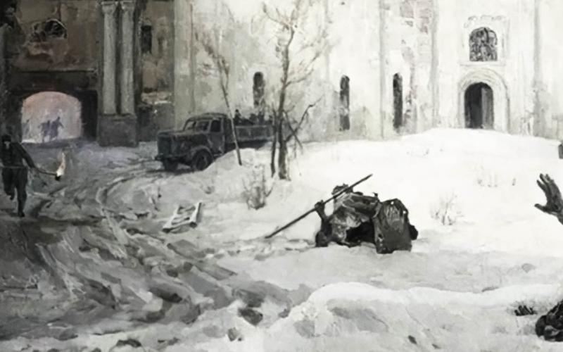 Творческий коллектив «Кукрыниксы» (Михаил Куприянов, Порфирий Крылов и Николай Соколов) в годы войны создали множество листовок и карикатур на фашистов. Их авторству принадлежит трагическая картина, отразившая ущерб, нансеённый Новгороду врагом.