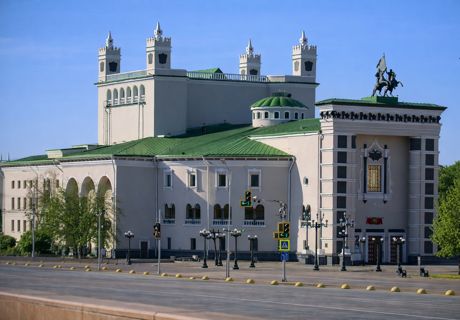 Неизменный интерес у гостей города вызывают живописный плафон зрительного зала работы художников Георгия Рублёва и Бориса Иорданского и скульптурная группа «Всадники» скульптора А. И. Тимона, расположенная над центральным порталом. Архитектура театра представляет собой удачный пример использования элементов национального бурятского убранства на общественных зданиях.