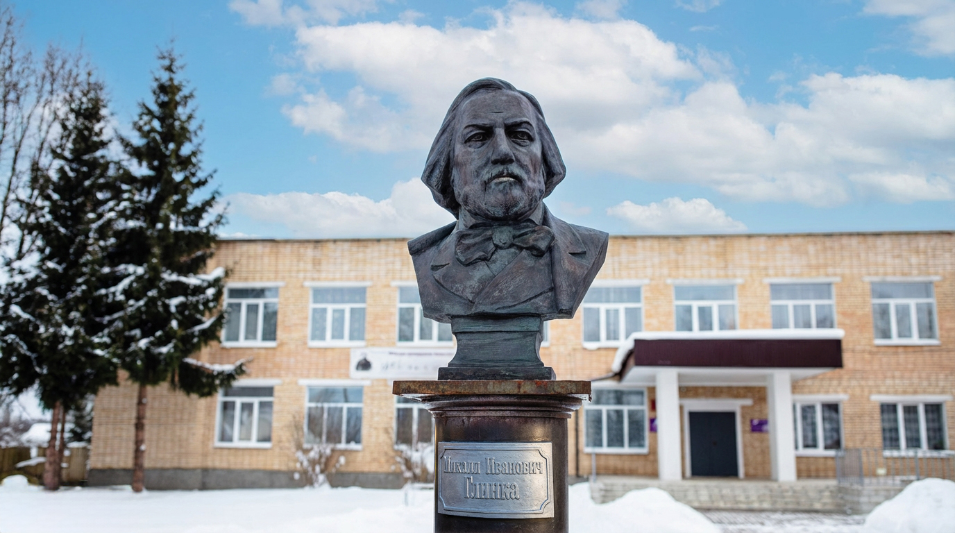 Бюст М. И. Глинки у здания детской музыкальной школы в г. Ельня